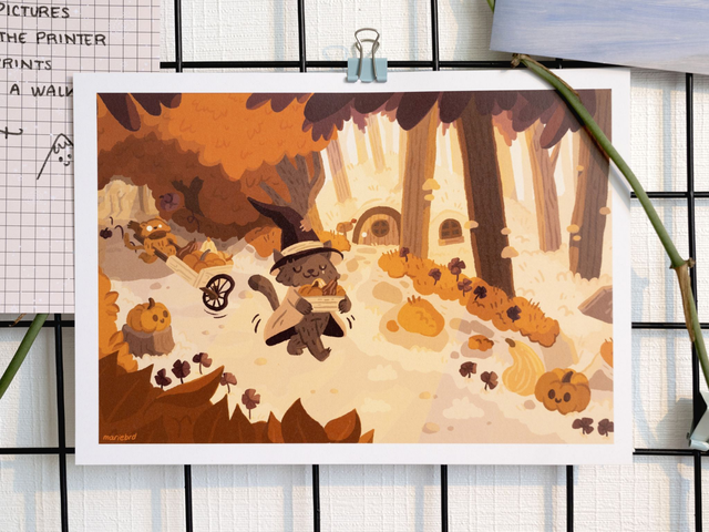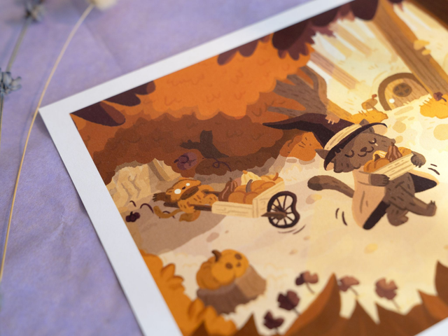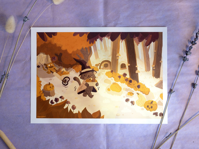 « Le chat sorcier inculque à son chaprenti les rudiments de l’activité de sorcier. Ils rapportent du marché les citrouilles et courges pour le souper : il faut prendre des forces pour ces longues journées d’apprentissage. »